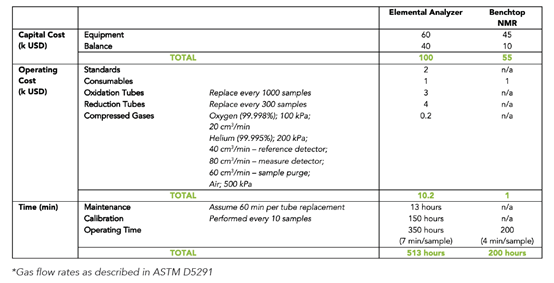 表一: 以3000個樣品為例,比對使用ASTM D5291 使用元素分析儀 (EA) 及桌上型 NMR 分析油品的氫含量所需之成本與時間