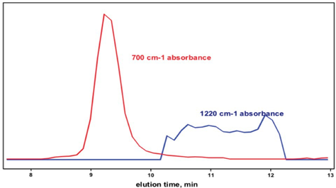該洗脫峰的[700cm-1/1735cm-1]譜帶比幾乎沒有明顯漂移;顯示成分變化不大。該洗脫區域的光譜看起來是苯乙烯-丙烯酸酯共聚物的光譜。